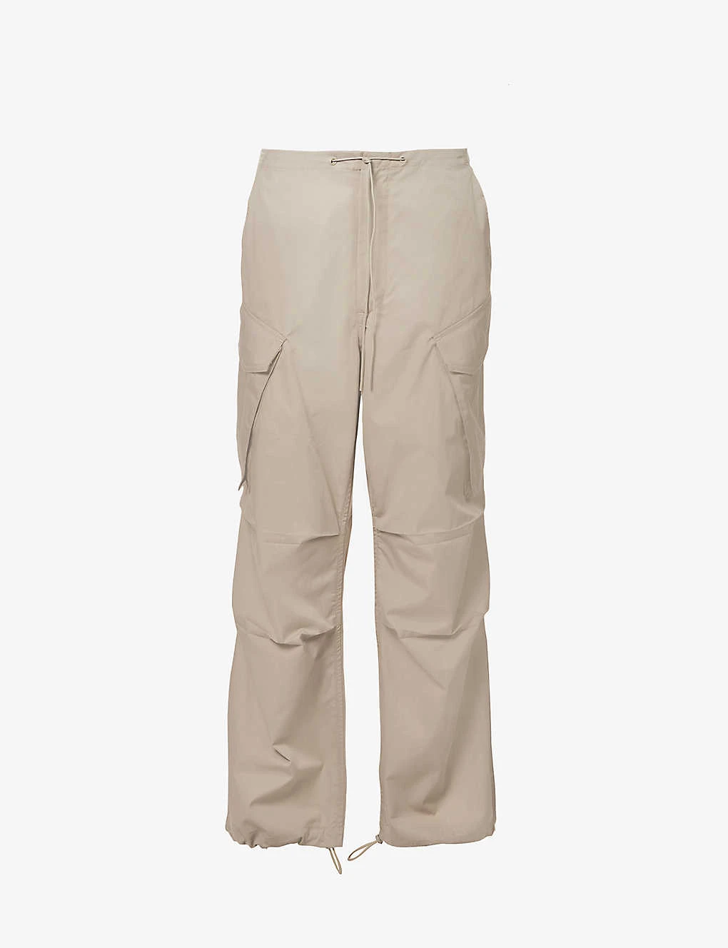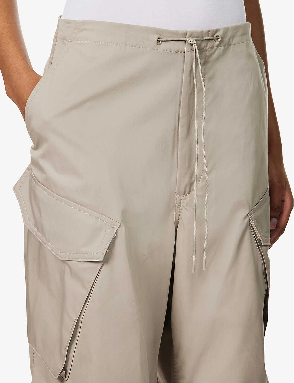 - Relaxed-fit, high-rise, wide leg, elasticated drawstring waistband, two slip pockets at front, buttoned flap pocket at back, exposed seams, drawstring hems
