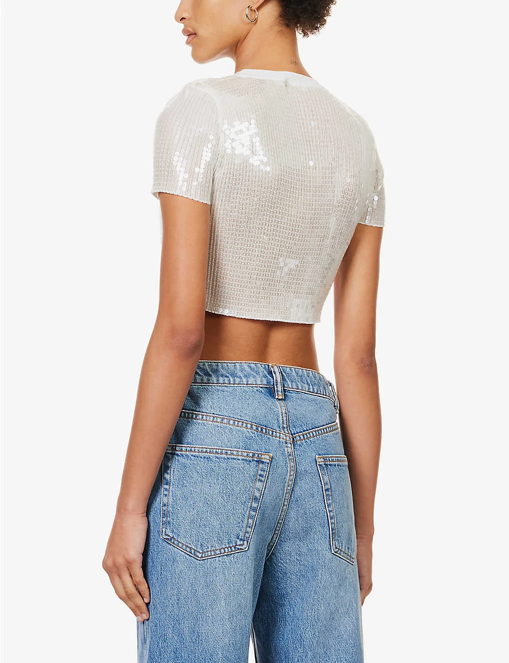 - Slim fit, round neck, ribbed trim at neck, short sleeves, ribbed texture, all-over sequin embellishment, cropped