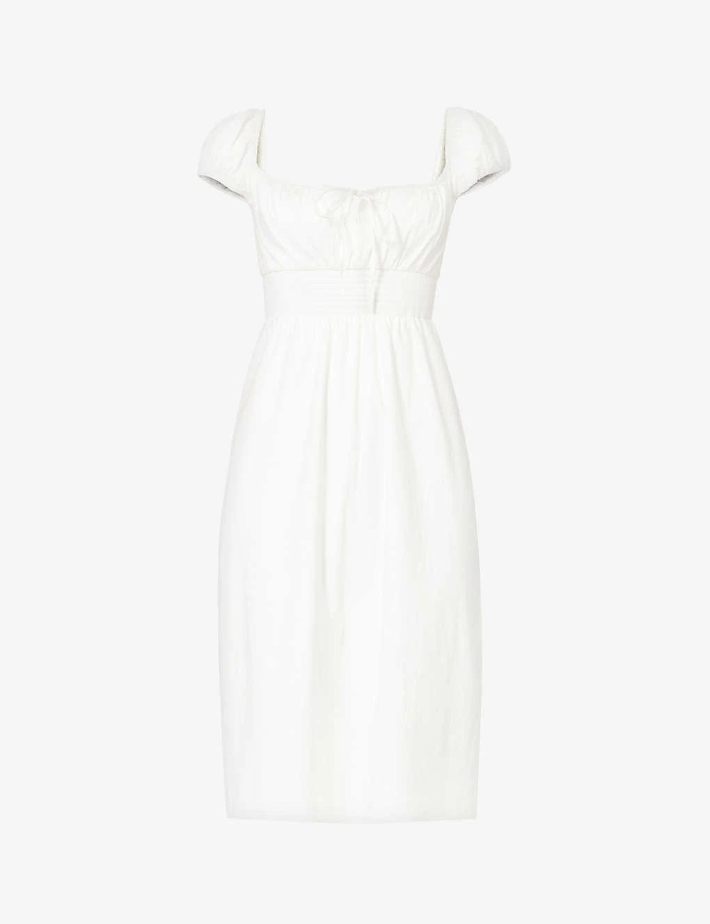- Regular fit, square neck, short cap sleeves, self-tie straps at neck, smocked waistband, gathered and pleated hem, lined
