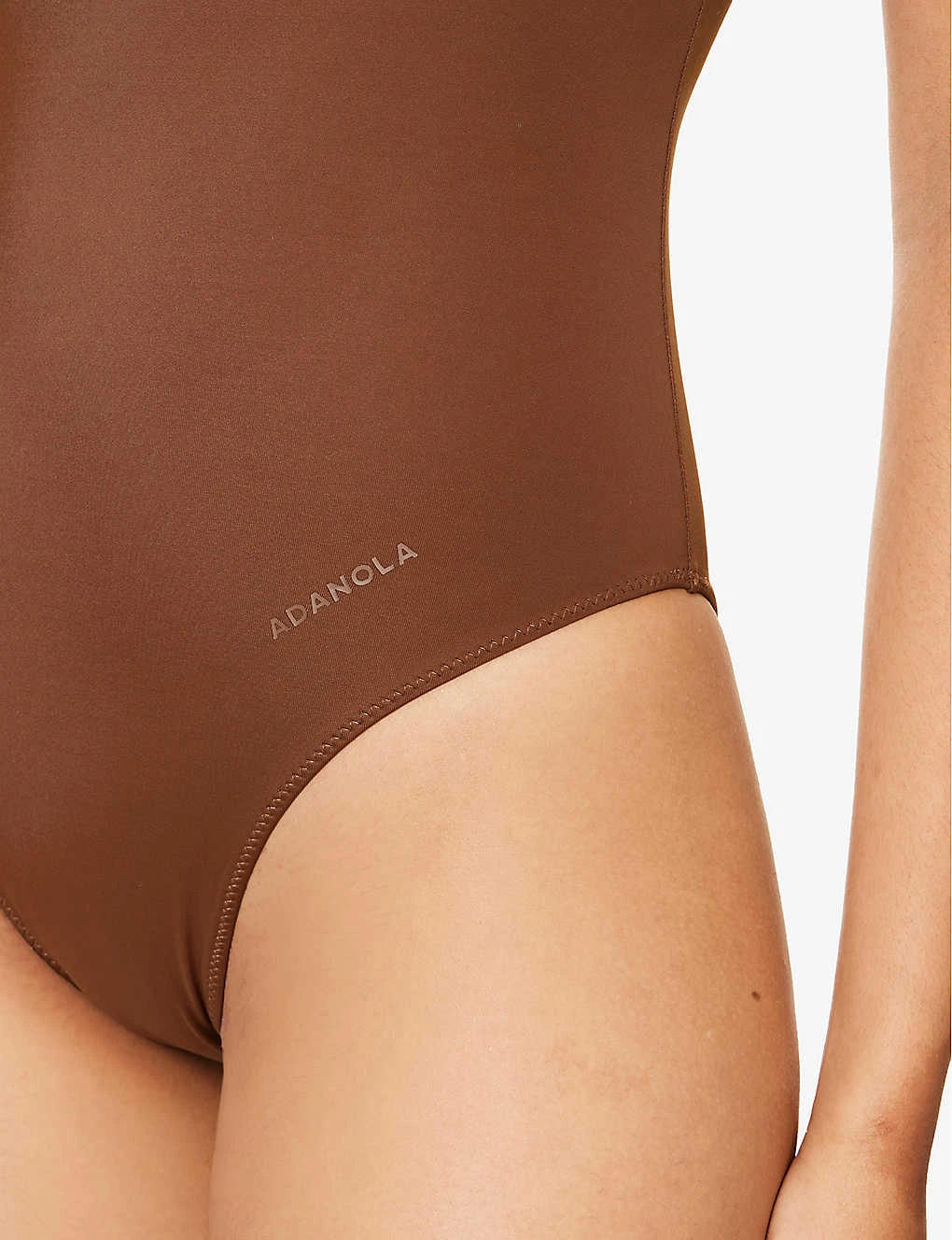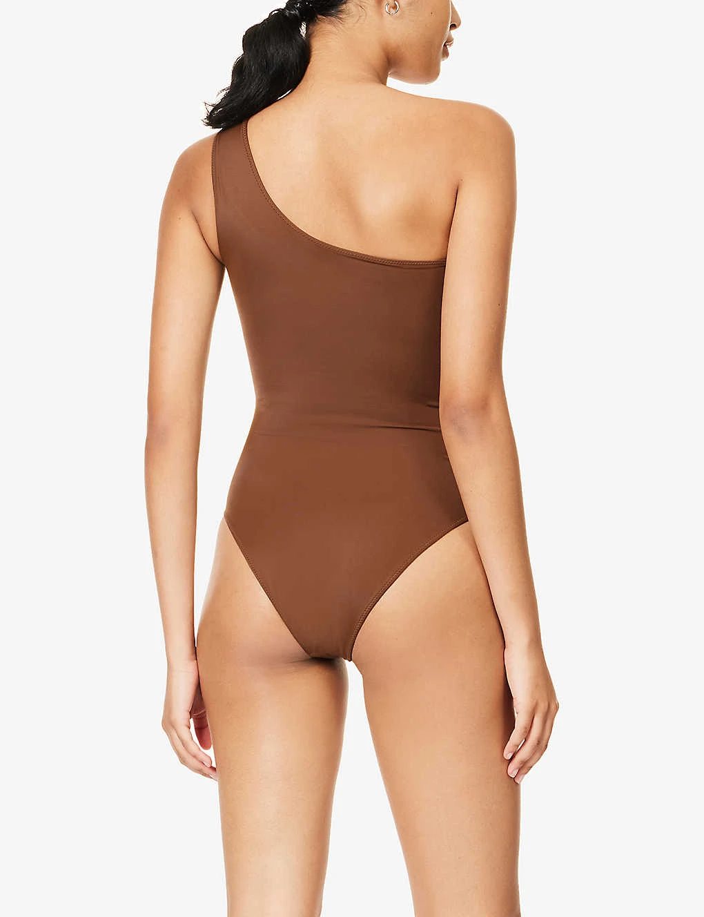 - Asymmetric neckline, one shoulder, tonal brand print at front, high leg