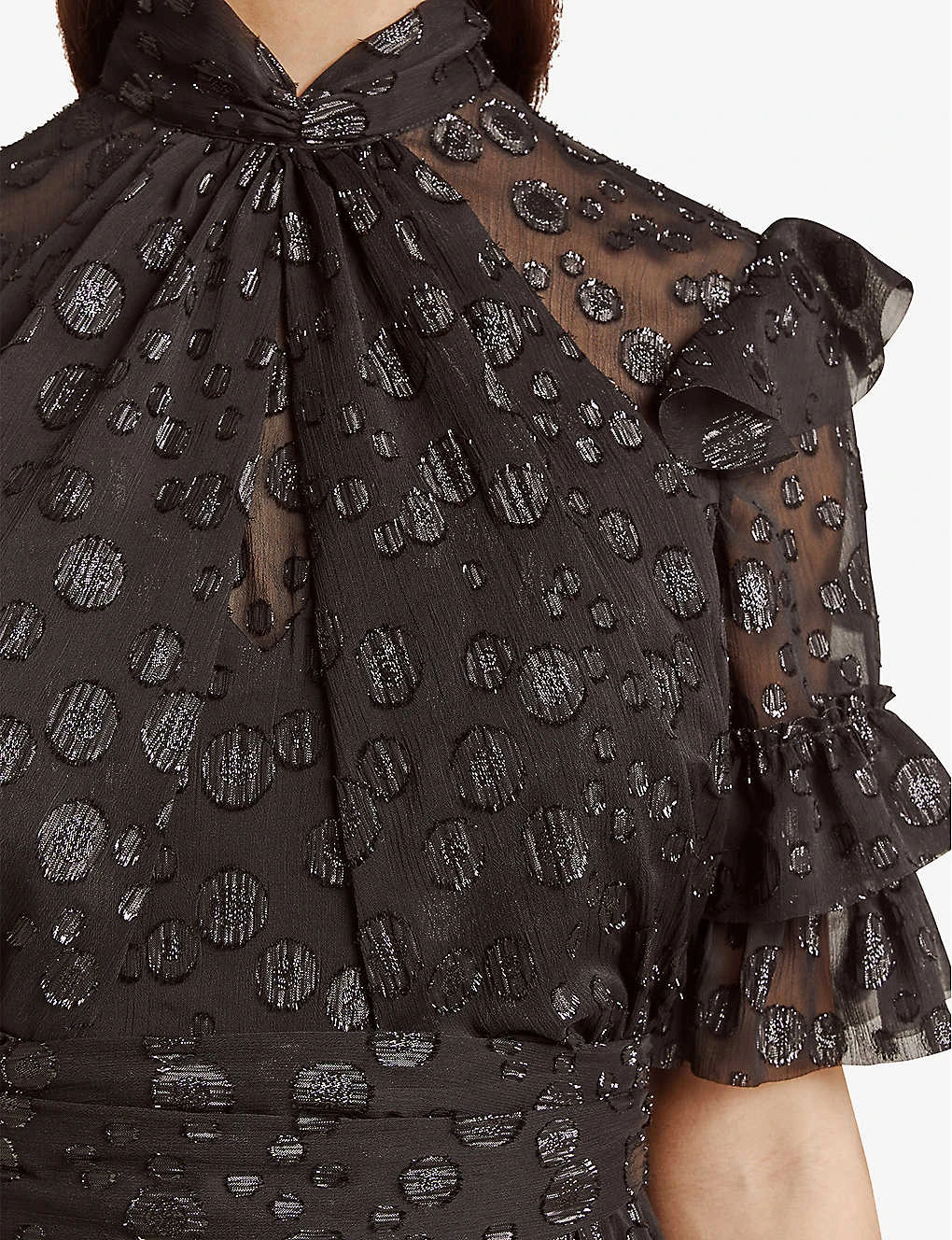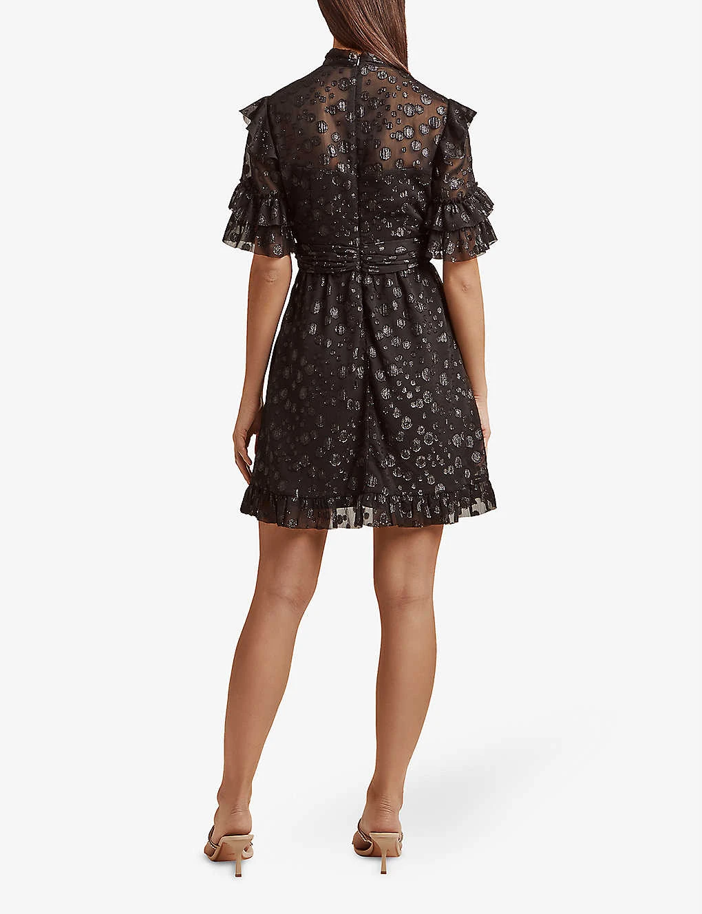 - High collar, short sleeves, all-over polka dot, metallic finish, tiered hem, mini length