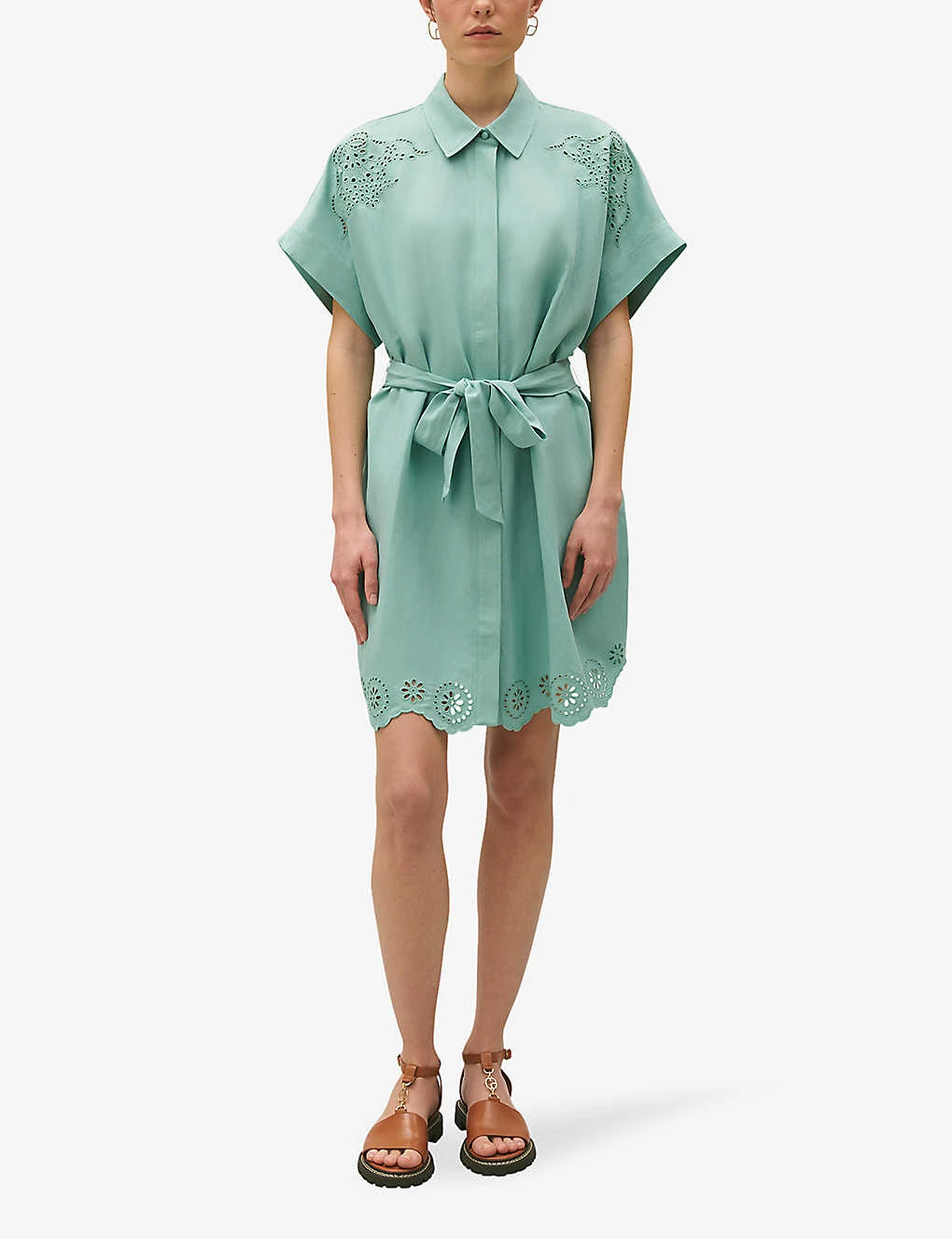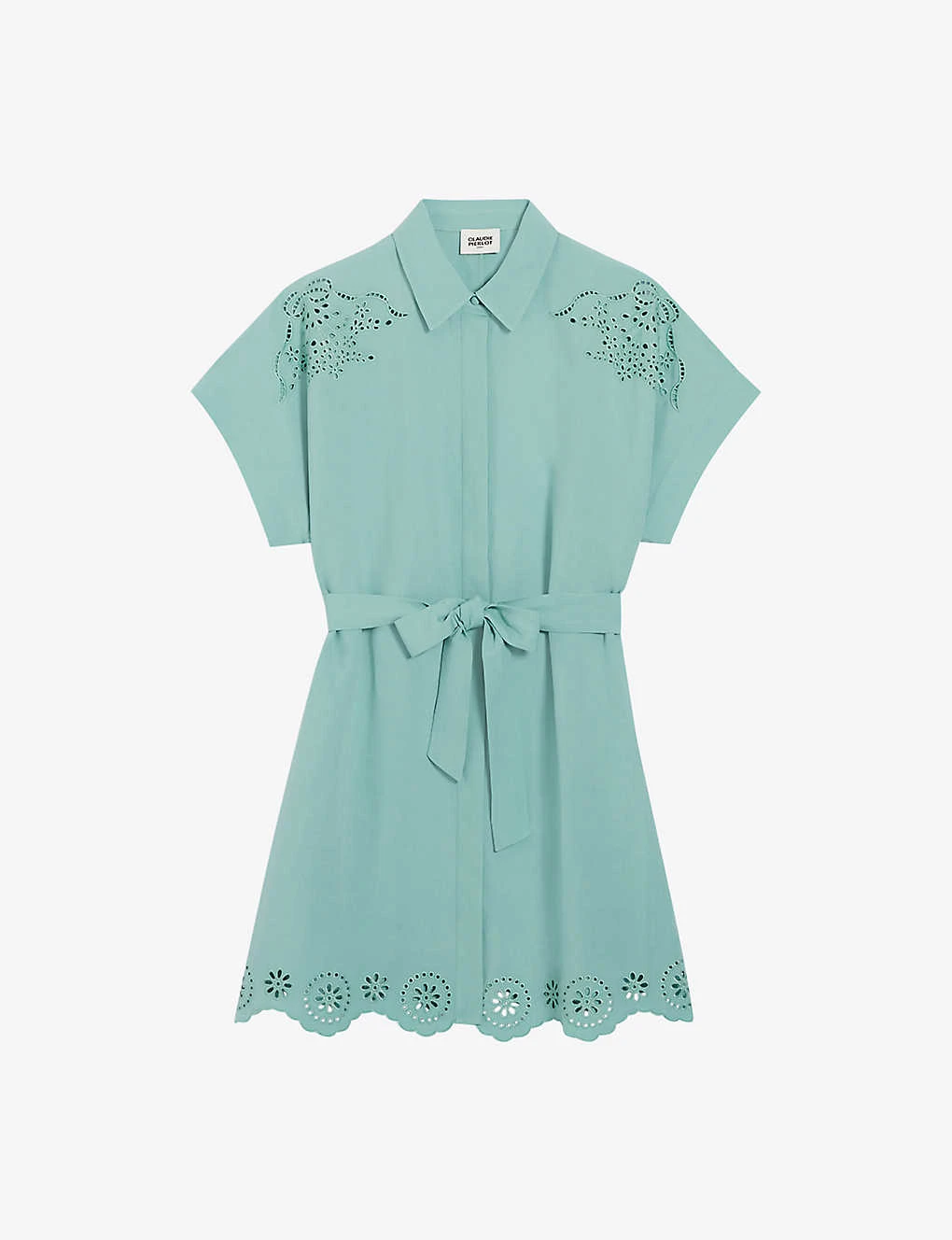 - Collared, short sleeves, broderie-anglaise detail, self-tie belt at the waist, mini silhouette