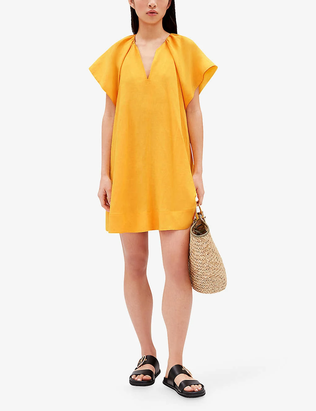 - Open neckline, short sleeves, flared silhouette, mini length, 2 pockets at the side