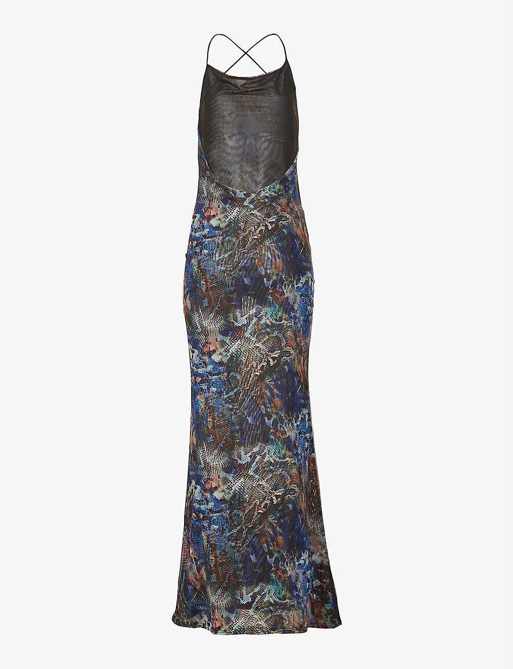 - Cowl neck, slim-fit, elasticated shoulder straps, all-over abstract pattern, mesh panels, fully lined