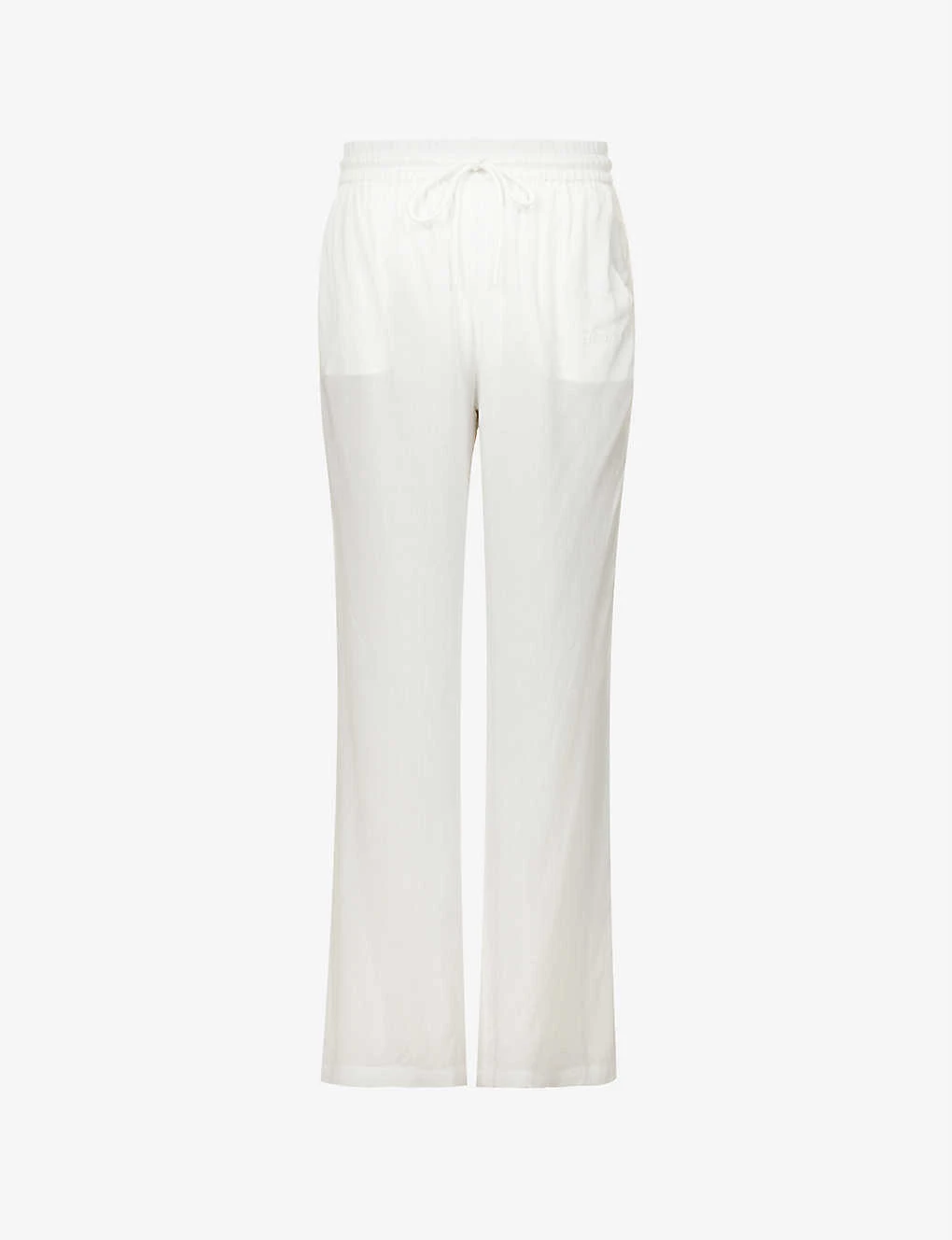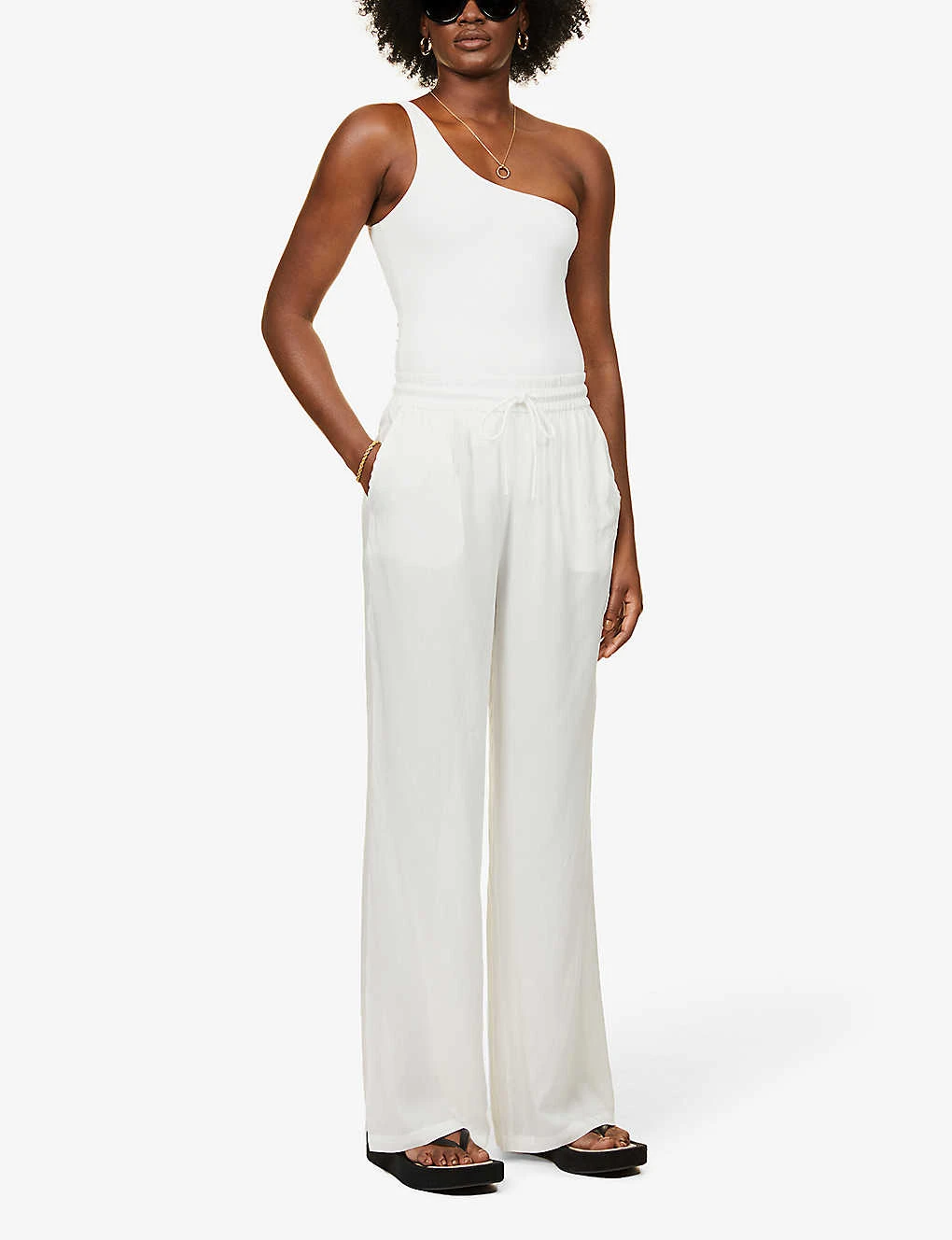 - Relaxed-fit, high-rise, wide leg, elasticated drawstring waistband, two slip pockets at front, embroidered branding at front, tonal stitching, straight hems