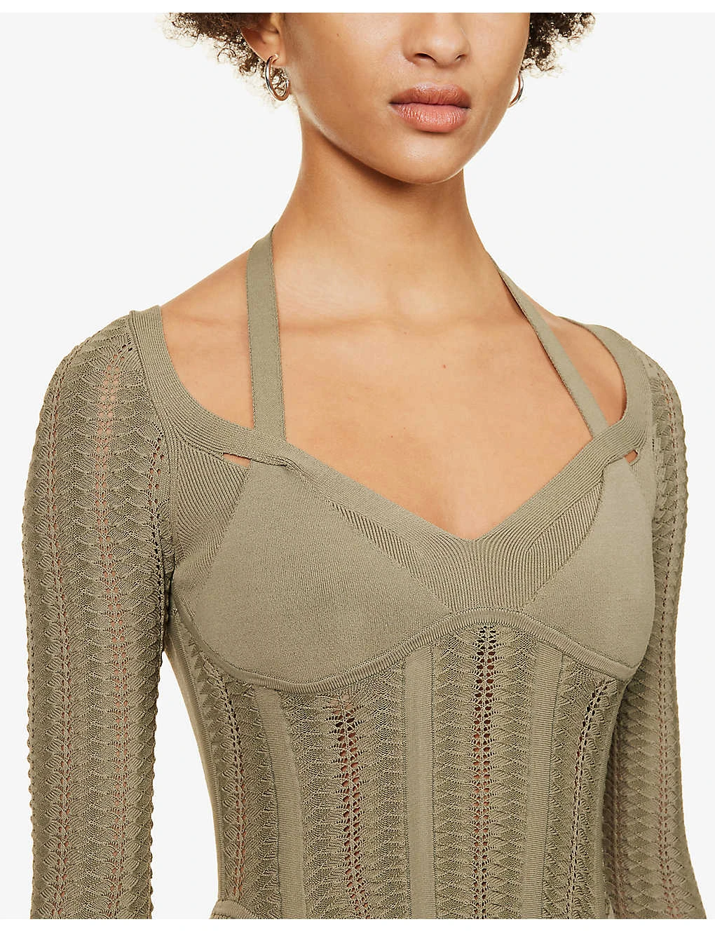 - Slim fit, scoop neckline, long sleeves, soft cups, corset bodice, geometric knitted design, scallop trims