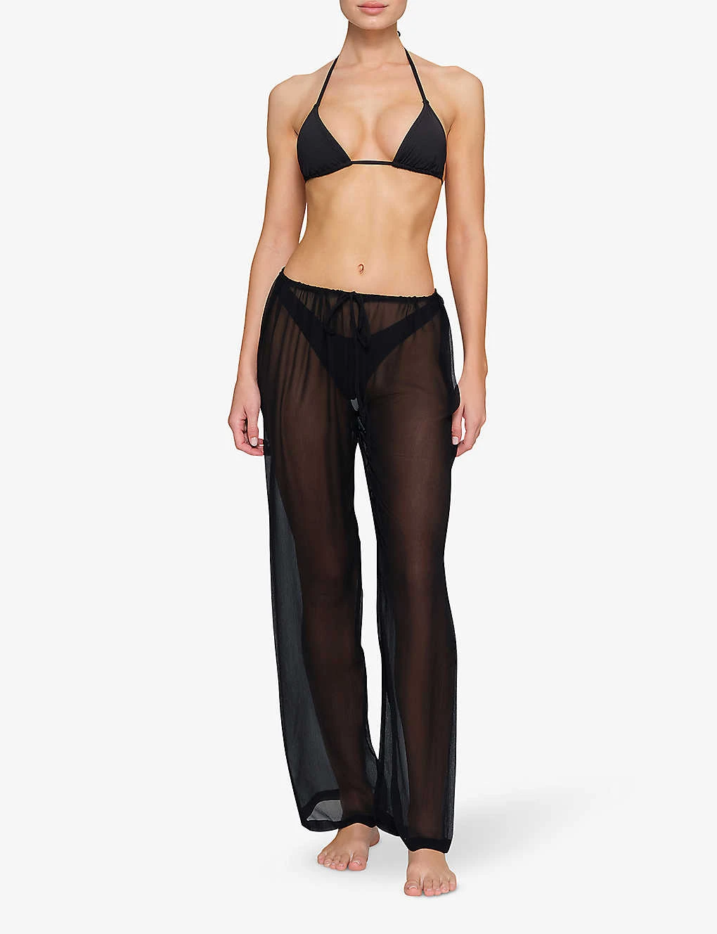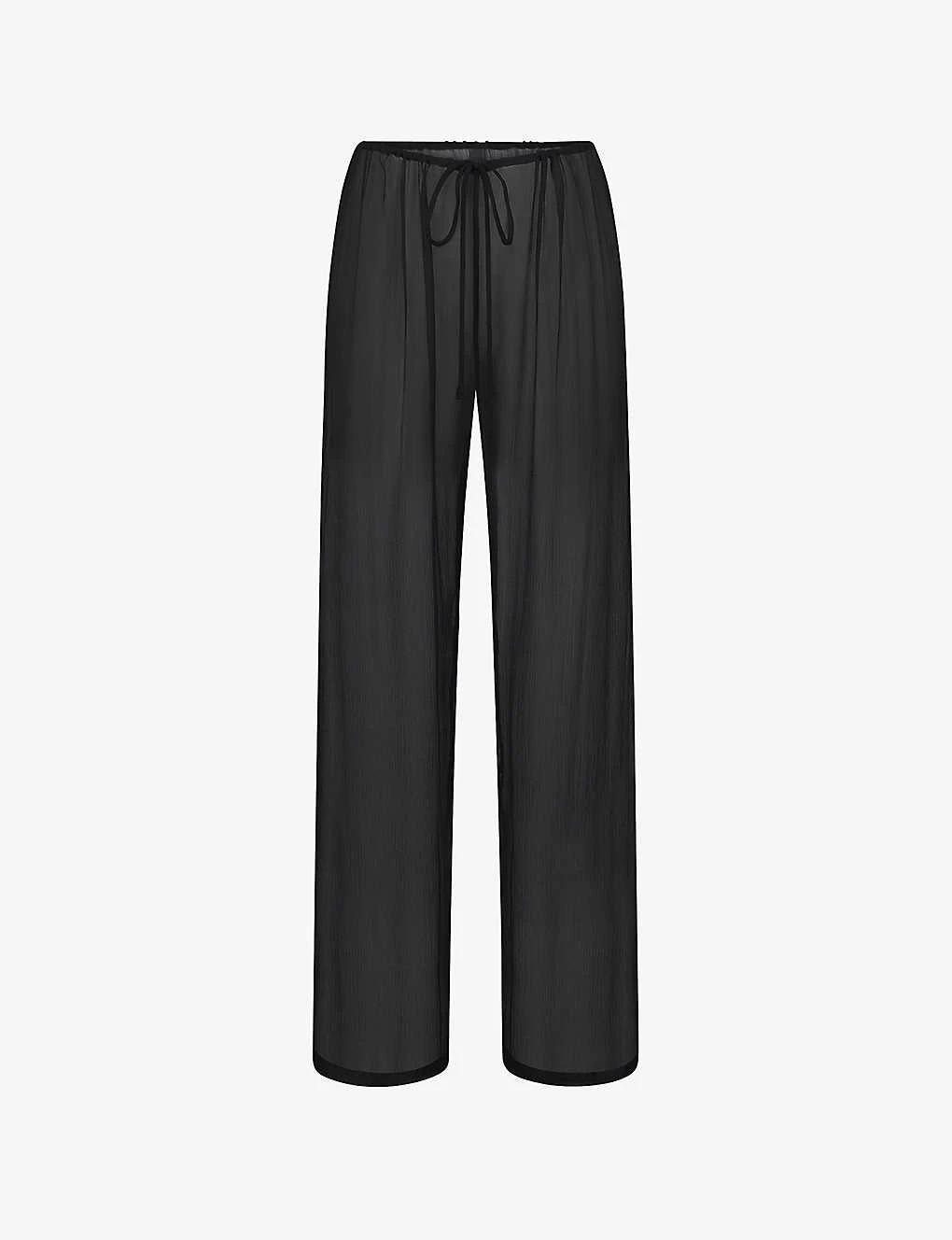 - Low rise, wide leg, adjustable drawstring waistband, sheer fabrication, unlined