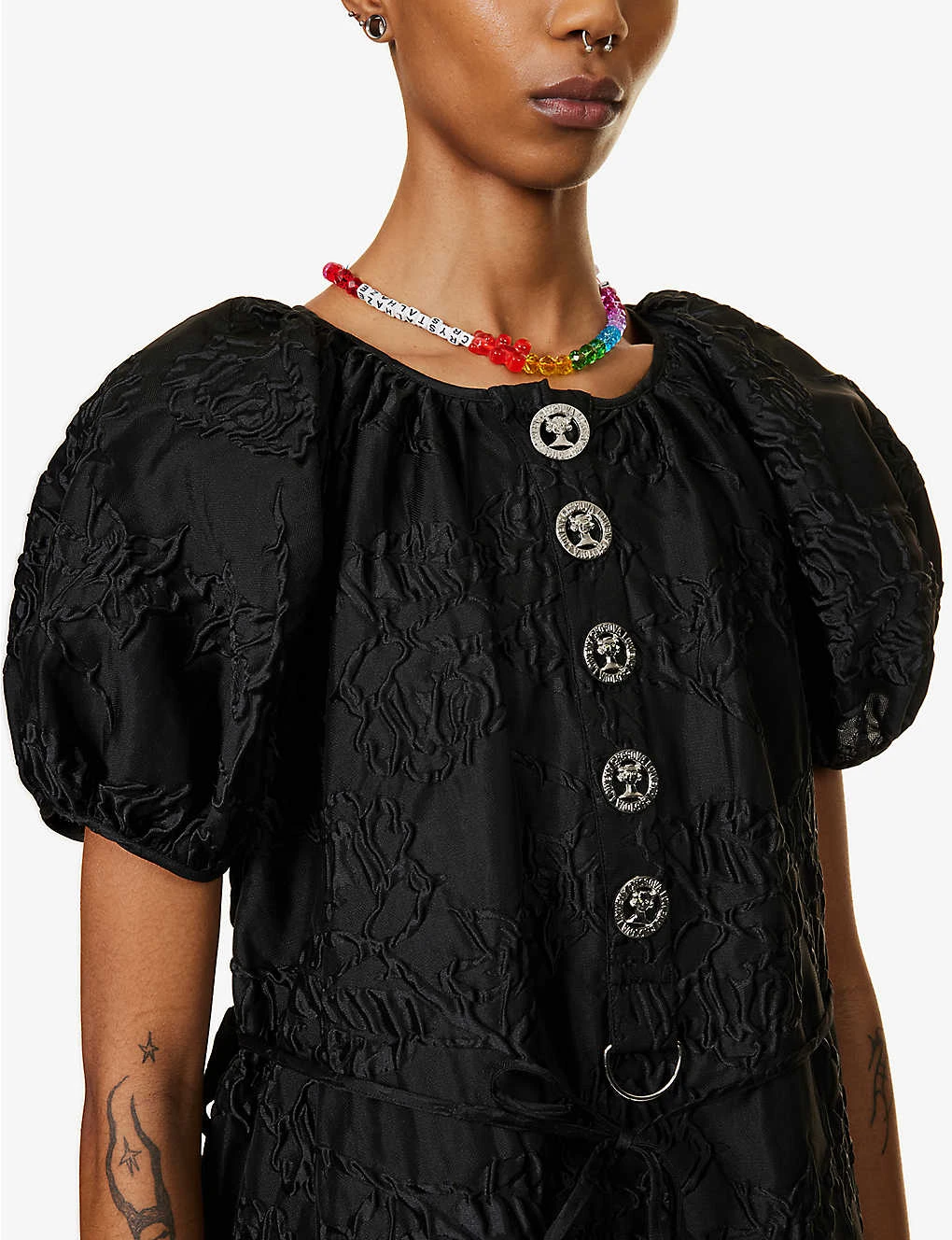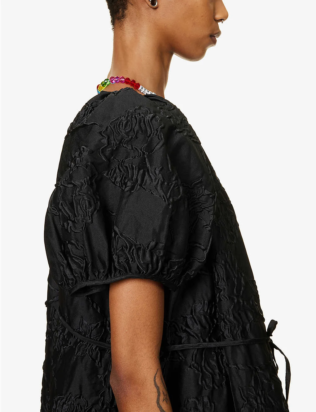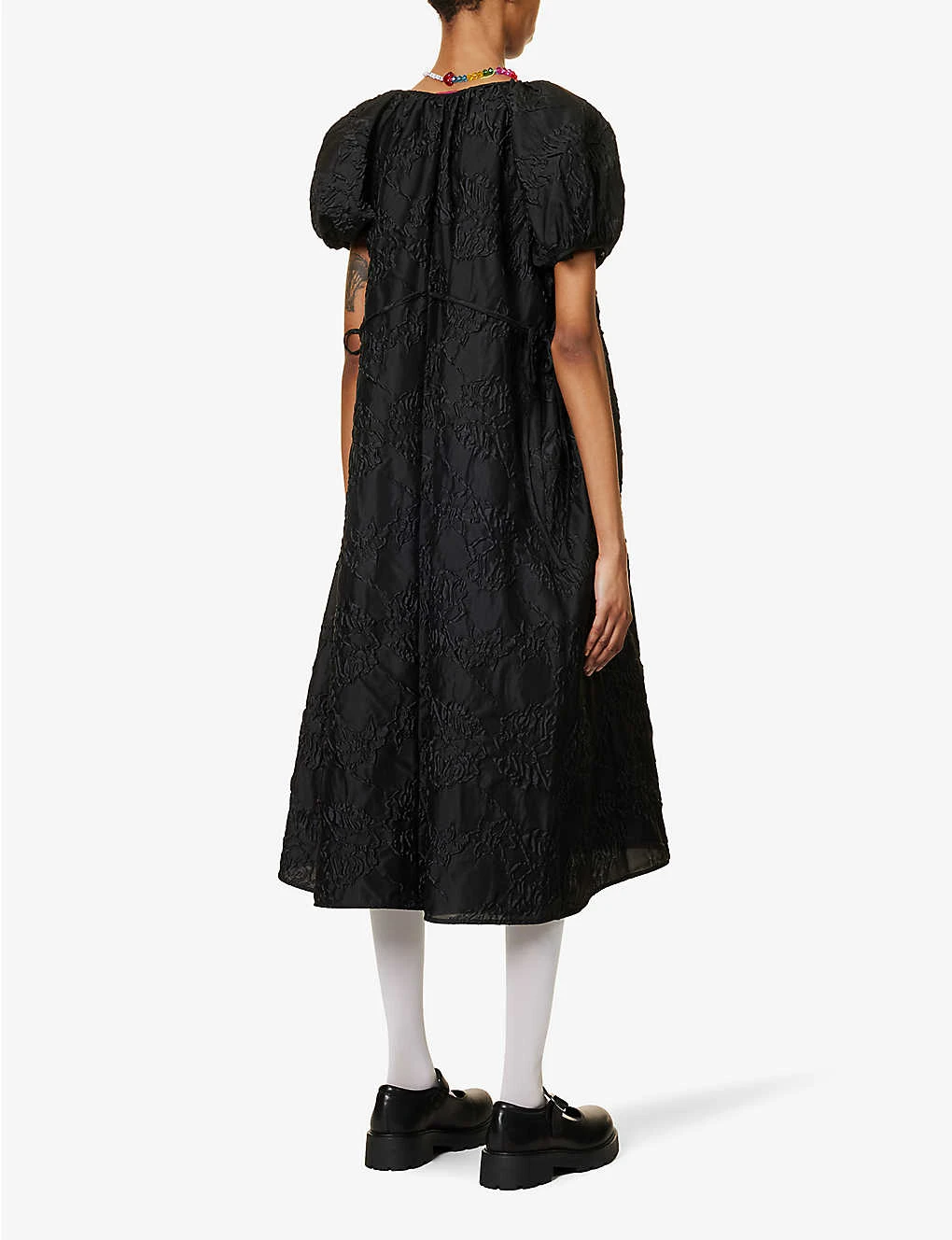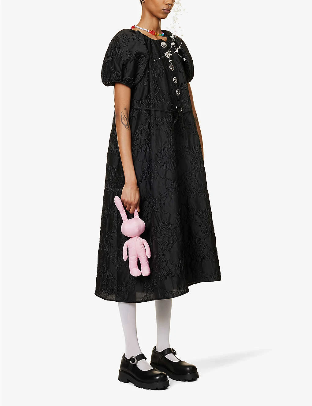 - Relaxed fit, round neckline, short puff sleeves, two slip pockets at front, self-tie belt at waist, all-over jacquard, silver-toned hardware, flared hem