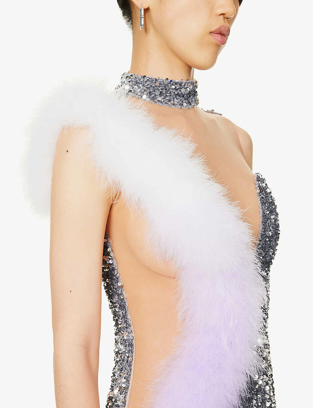 - Slim fit, high neck, sleeveless, mesh panel at front and side, faux-fur embellishment at front, all over velour texture and sequin embellishment, fully lined, straight hem