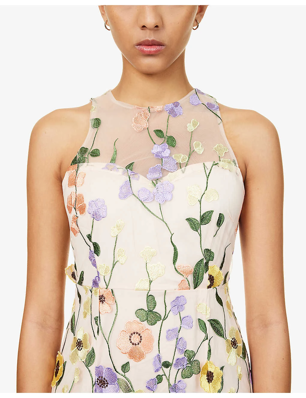 - Regular fit, round neckline, sleeveless, darts at chest, all-over floral embroidery and appliqué, partially lined