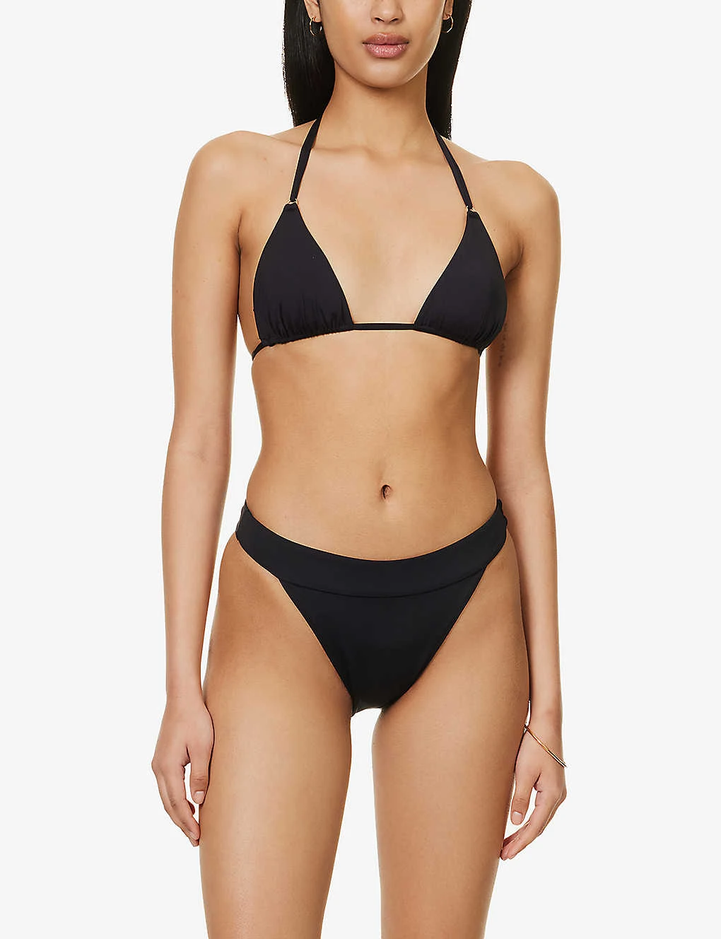 - Halter-neck, triangle cups, detachable padding, gold-toned hardware, fully lined