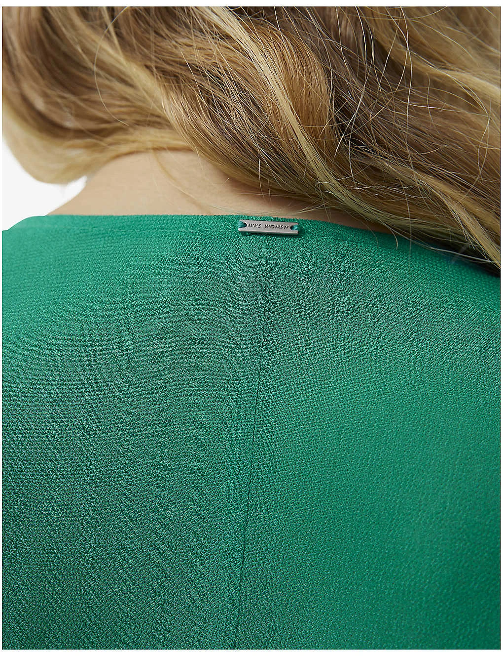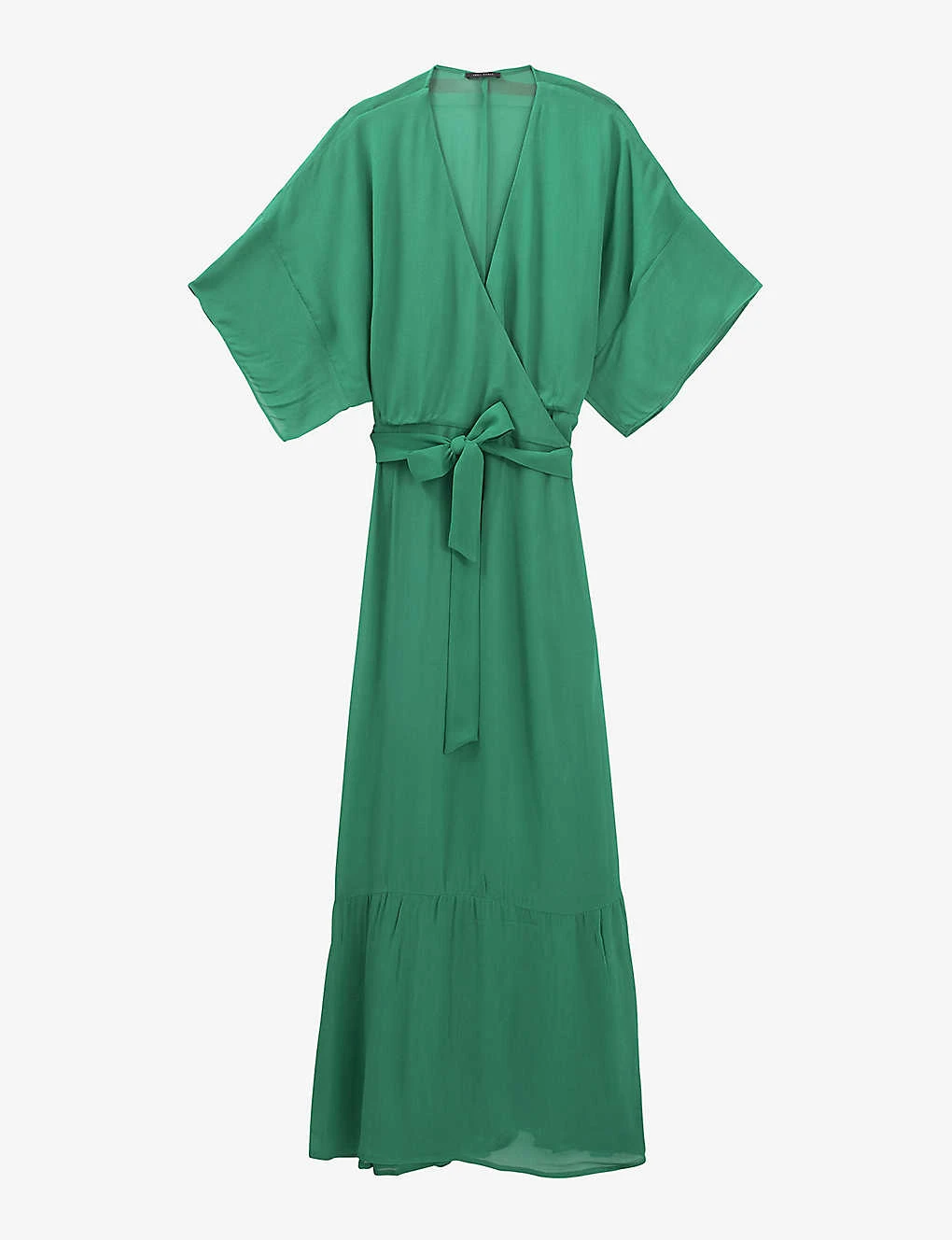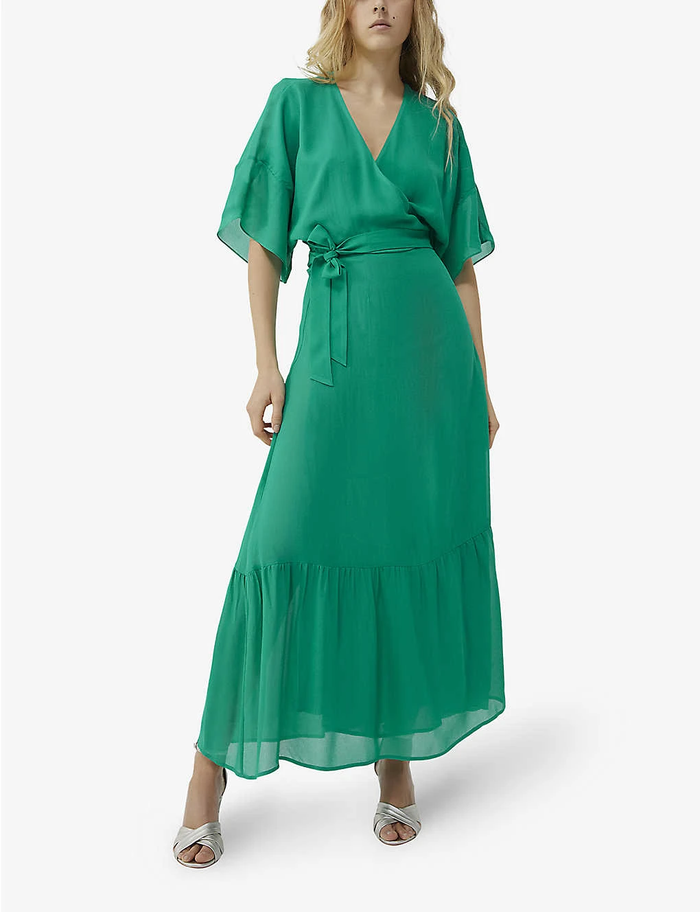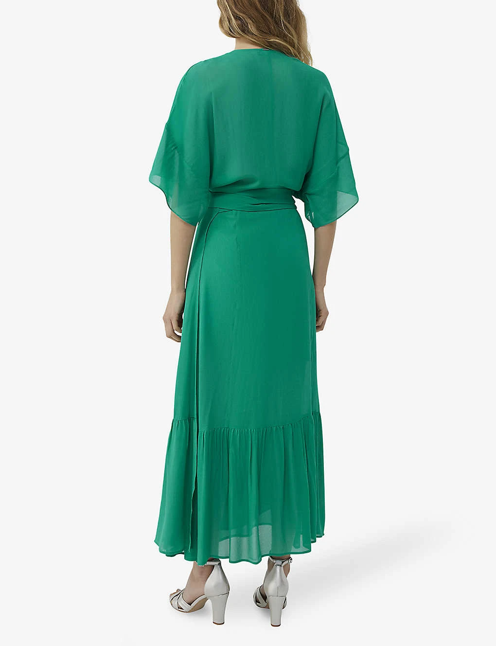 - V neckline, short sleeves, wrap-over design, frill-detail at the hem, belted waist, midi length