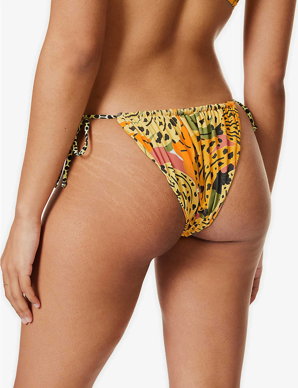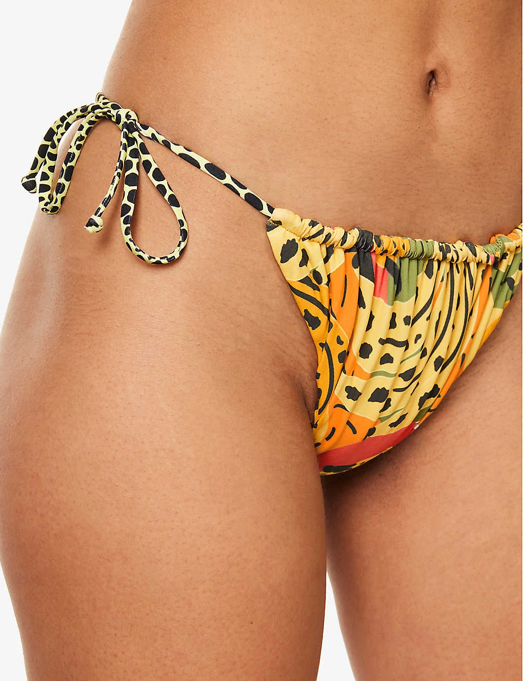- Mid-rise, elasticated waistband, high leg, self-tie with beads at sides, all-over abstract design