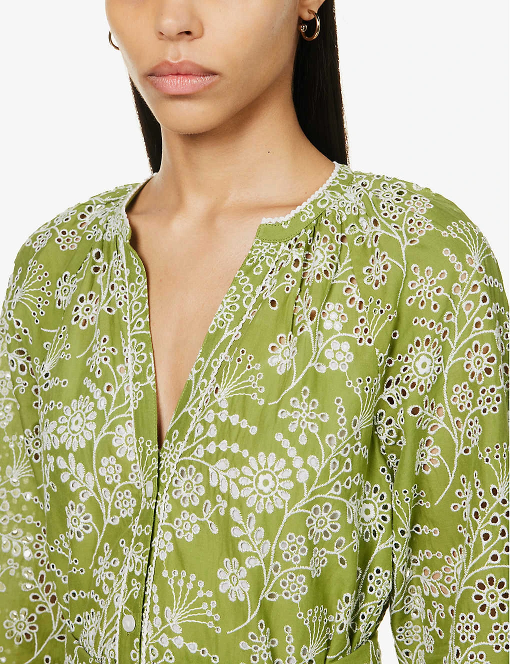 - Regular fit, round neckline, long puff sleeves, elasticated sleeve hems, all-over floral broderie pattern, contrast stitching, self-tie at waist, flared hem