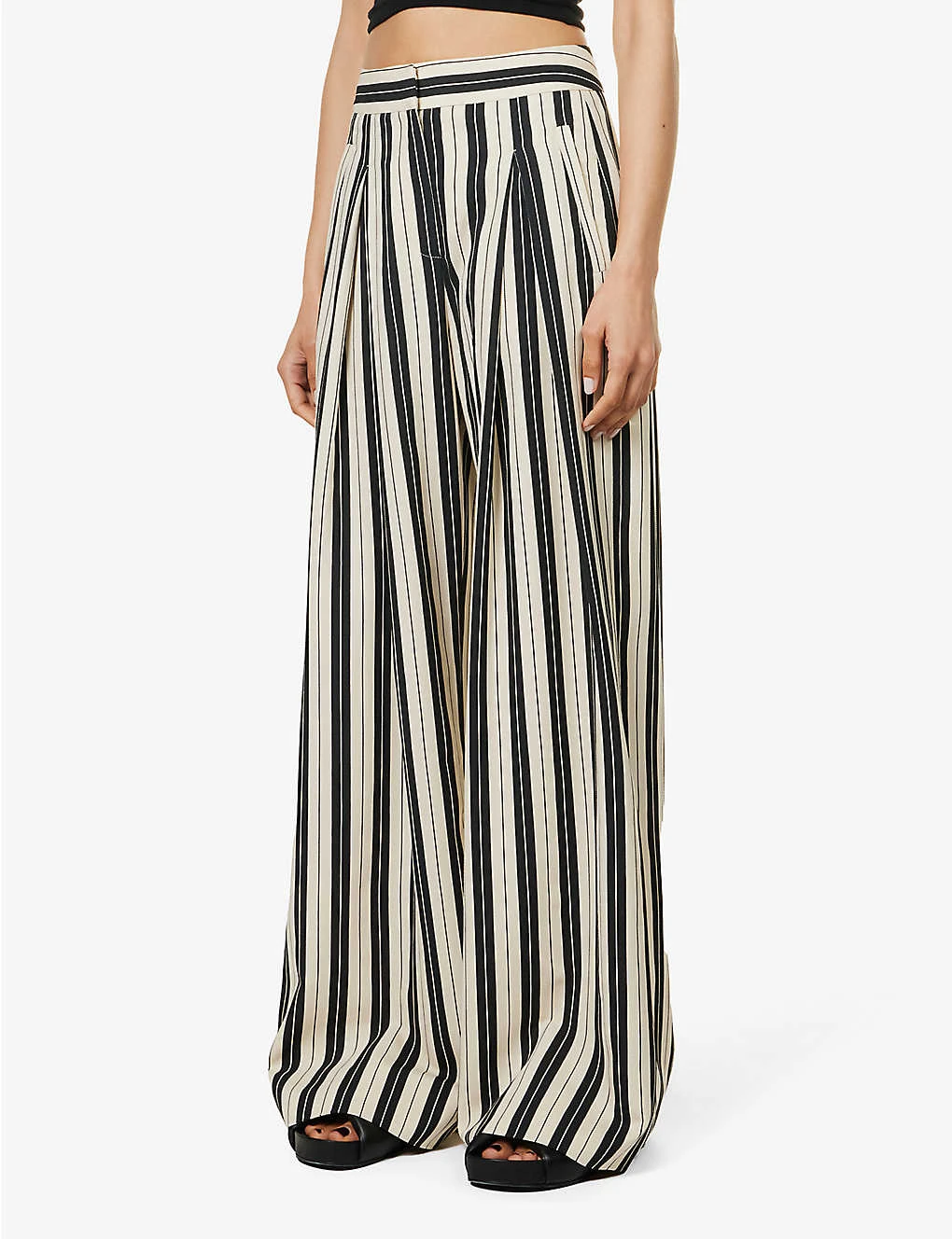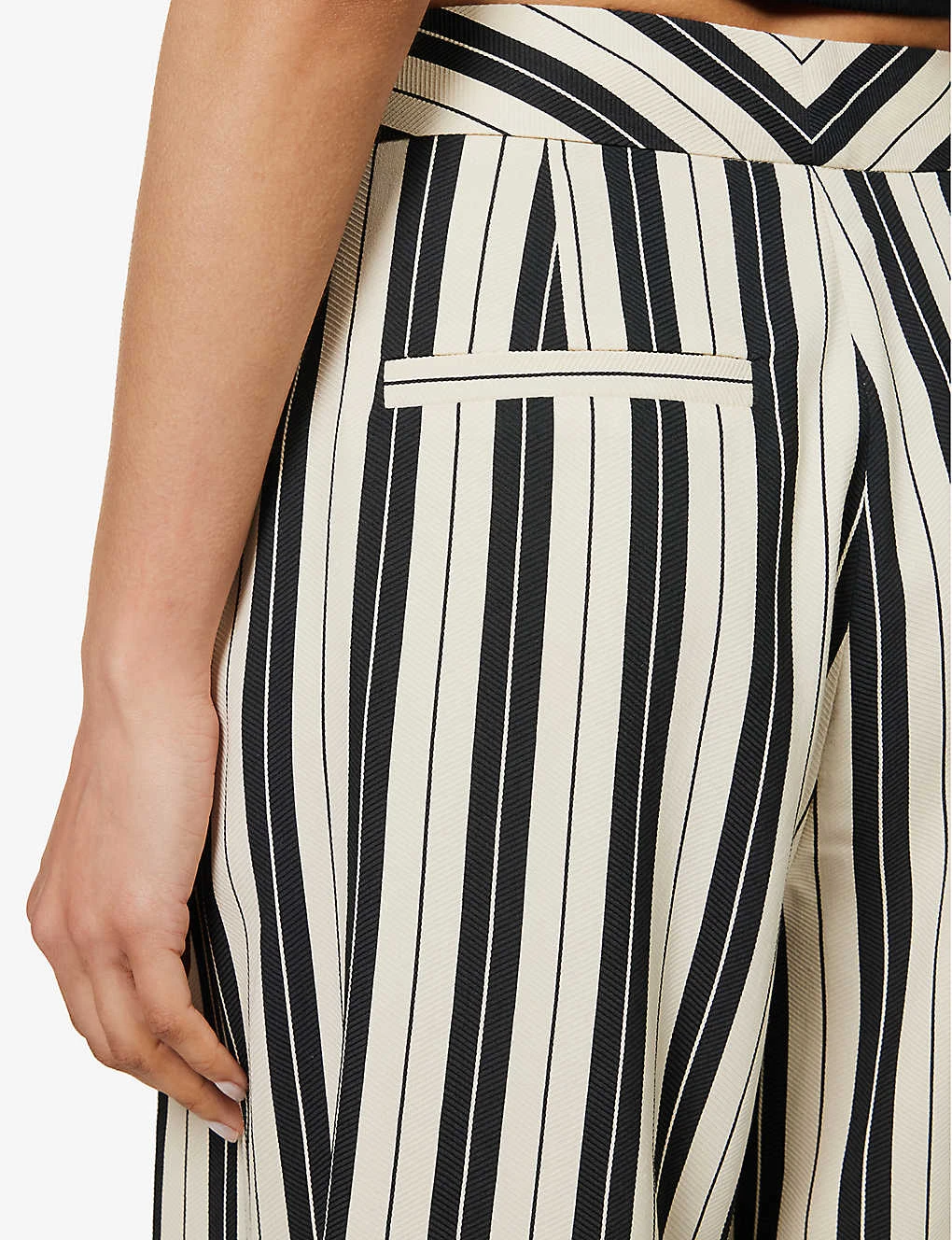 - Regular fit, high rise, wide leg, structured waistband, two angled slip pockets at front, pleats at front, darts at back, two welt pockets at back, all-over stripe pattern, zig-zag woven texture