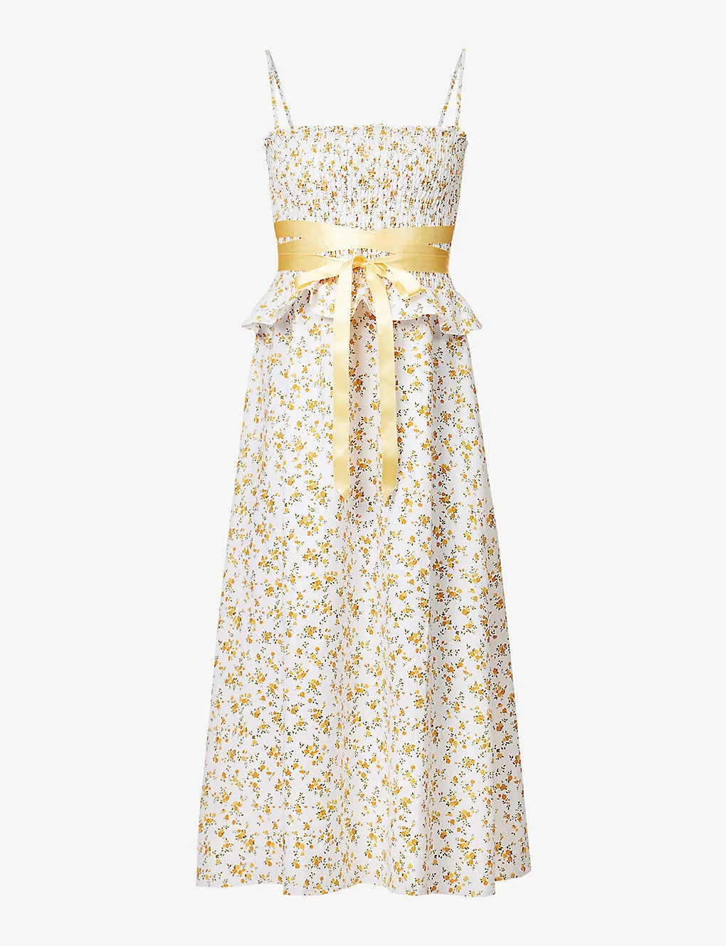 - Regular fit, square neckline, adjustable shoulder straps, shirred bodice, contrast self-tie fastening at bodice, ruffle trim, all-over print