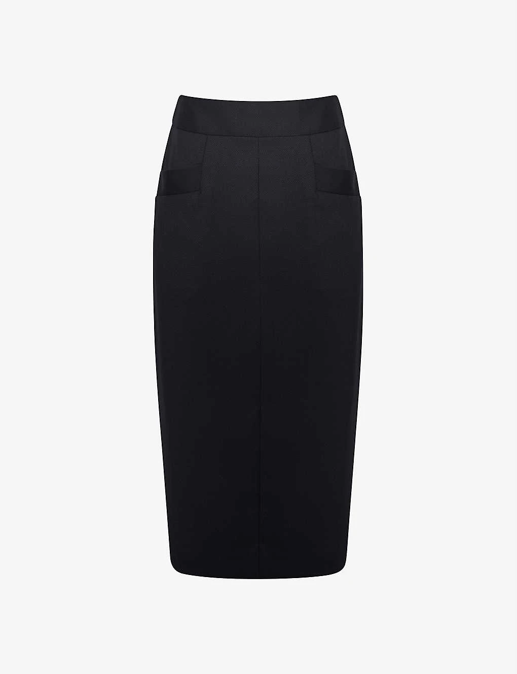 - Slim fit, high waist, tailored design, pencil style, two side slip pockets, concealed back zip fastening, slit to the back, midi length