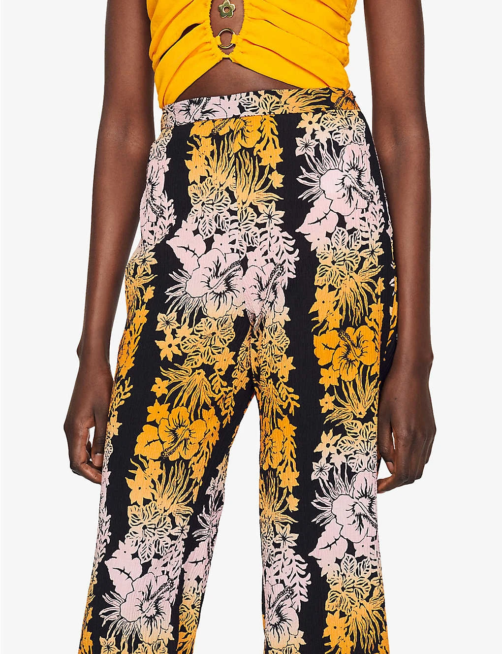 - Loose ft, wide leg, high rise, all-over floral print, all-over tonal stitching