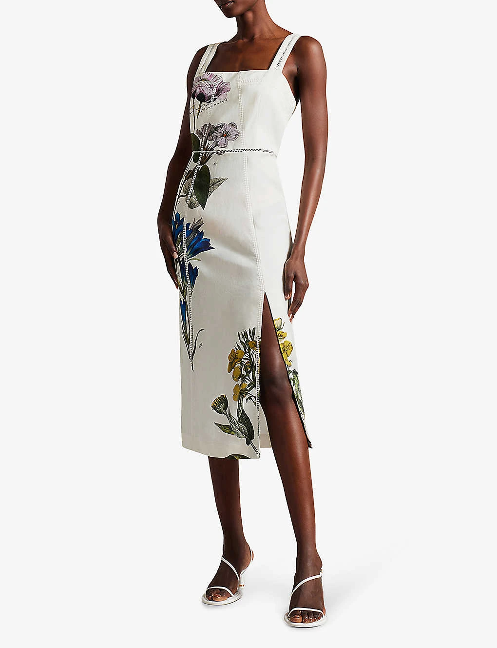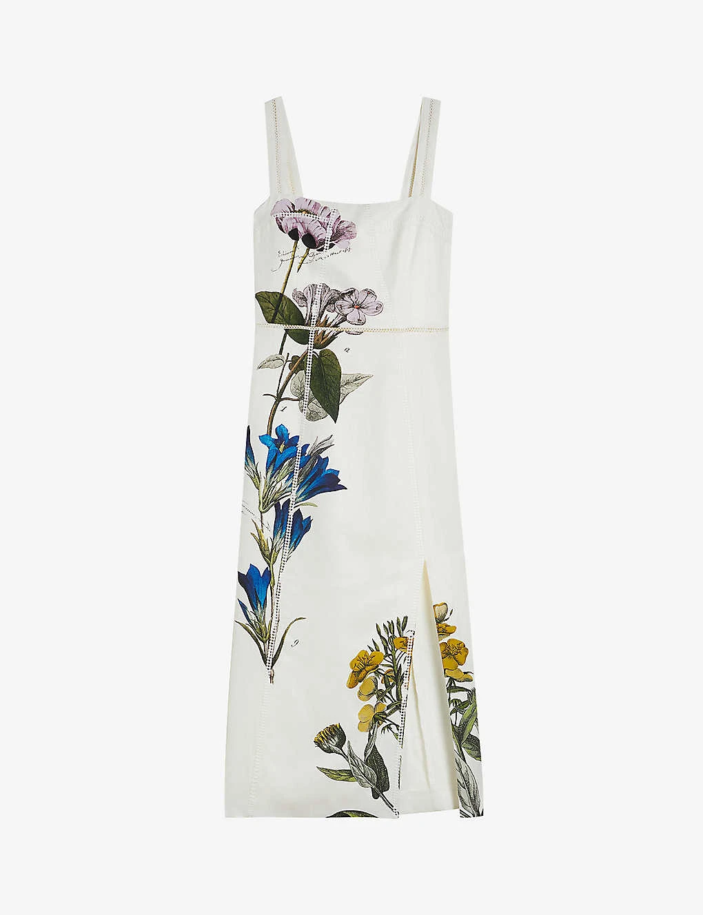 - Square-neck, thick straps, sleeveless, embroidered-detail, floral-print throughout, leg-slit at the front
