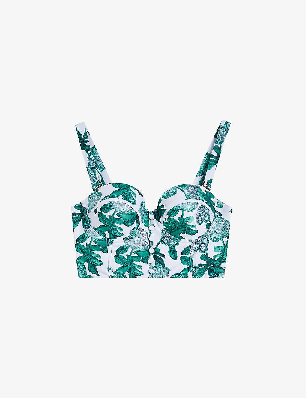 - Balconette cups, adjustable straps, decorative buttons front, branded gold-tone hardware, all-over seam detailing, all-over floral print