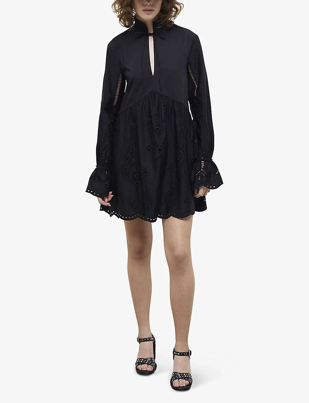 - High ruched neck, self-tie a the neckline, long sleeves, elasticated cuffs, openwork and broderie anglaise details, scalloped trim