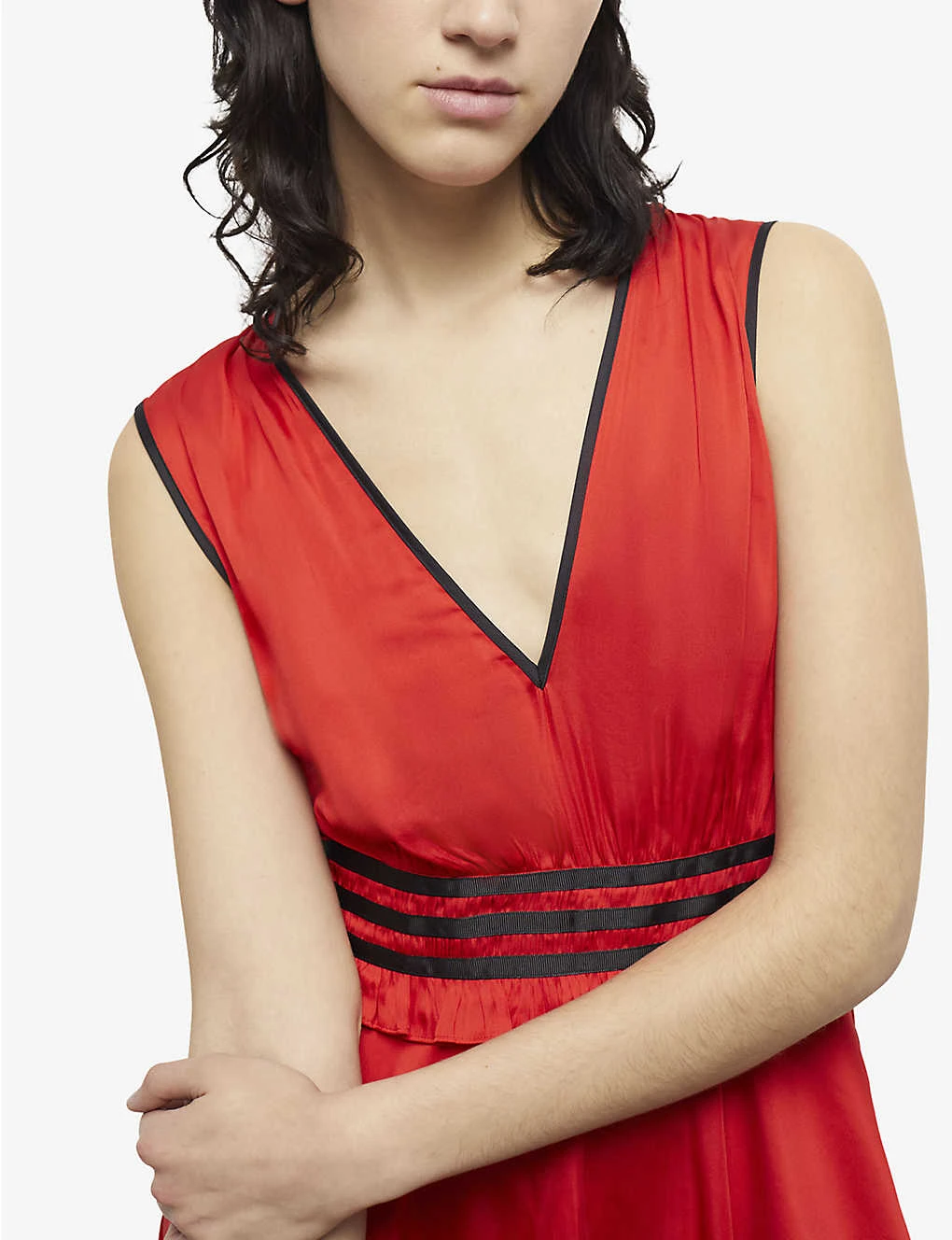 - V-neck, sleeveless, contrasting grosgrain trim at waistband, elasticated waistband, frills at waist, flared skirt
