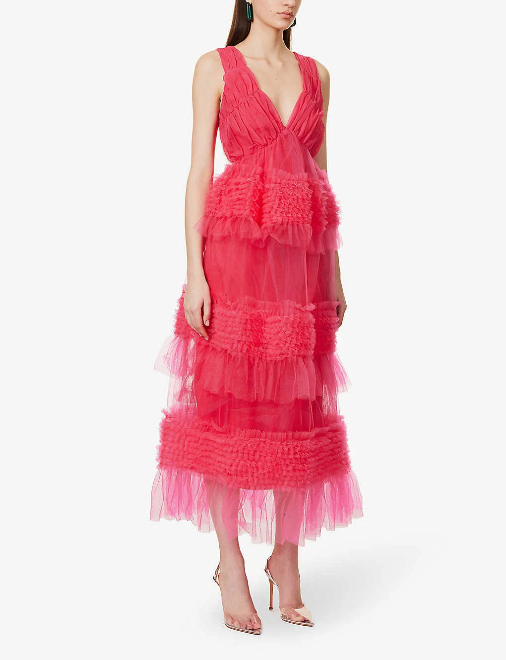 - Regular fit, V-neck, sleeveless, ruching at bodice, semi-sheer, all-over tiered and ruffled skirt, fully lined