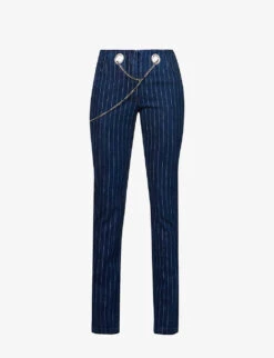 - Slim fit, mid-rise, straight leg, structured waistband, detachable chain belt, five pockets, all-over pinstripe pattern, silver-toned hardware