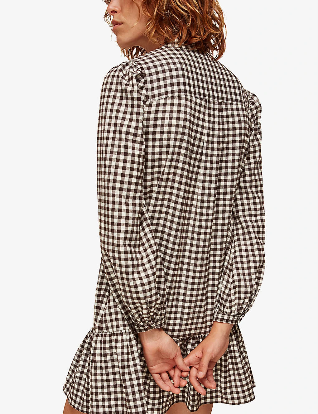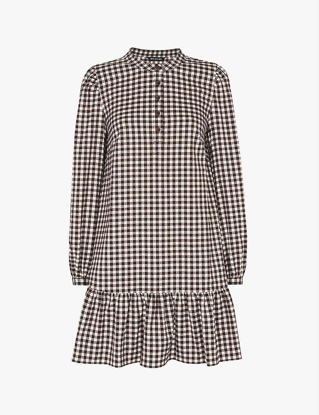 - Round neck, long sleeves, button fastenings, gingham print, ruffle hem, straight hem