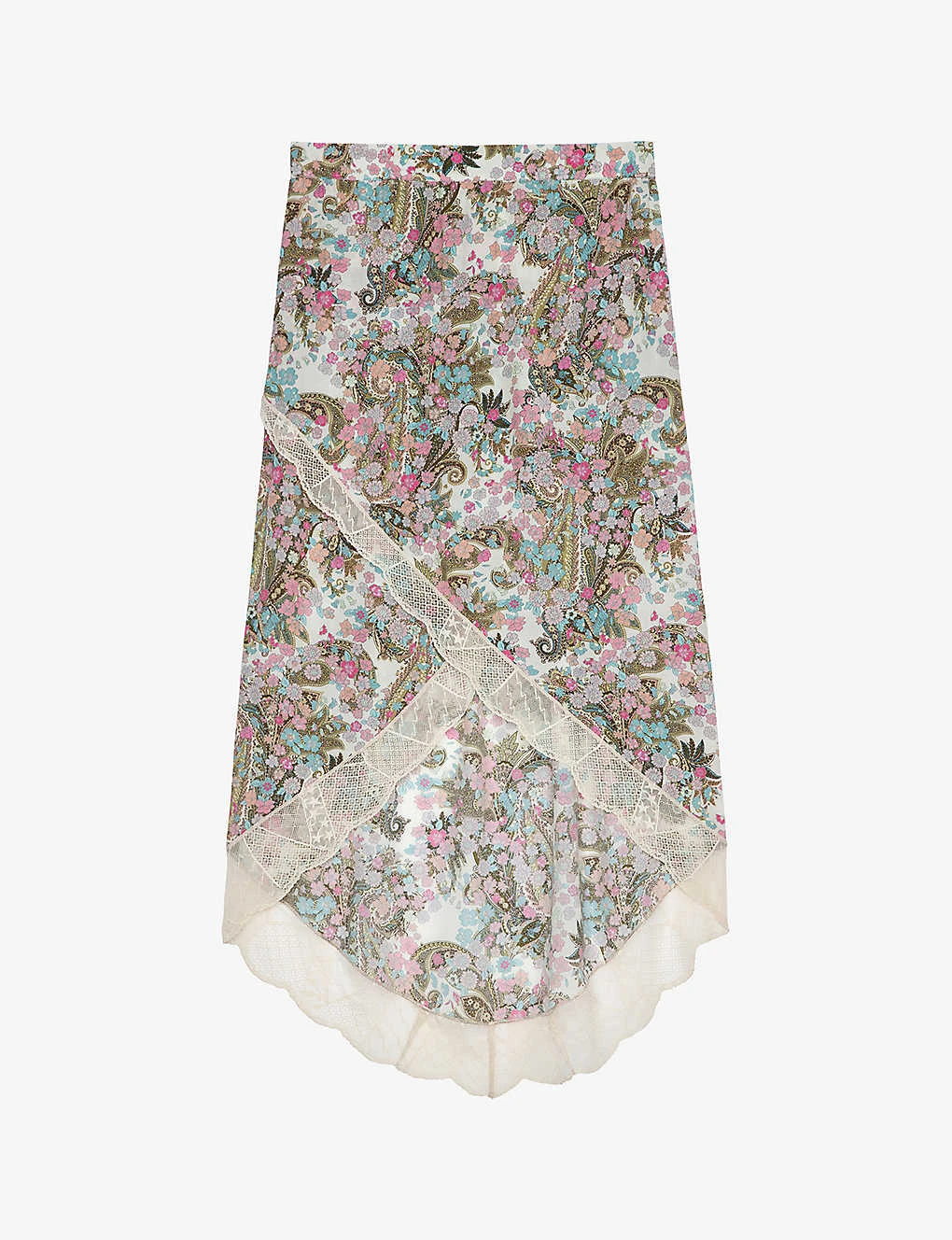 - High-rise, midi, fitted waist, all-over floral print, wrap-over silhouette, asymmetric hem, lace trim