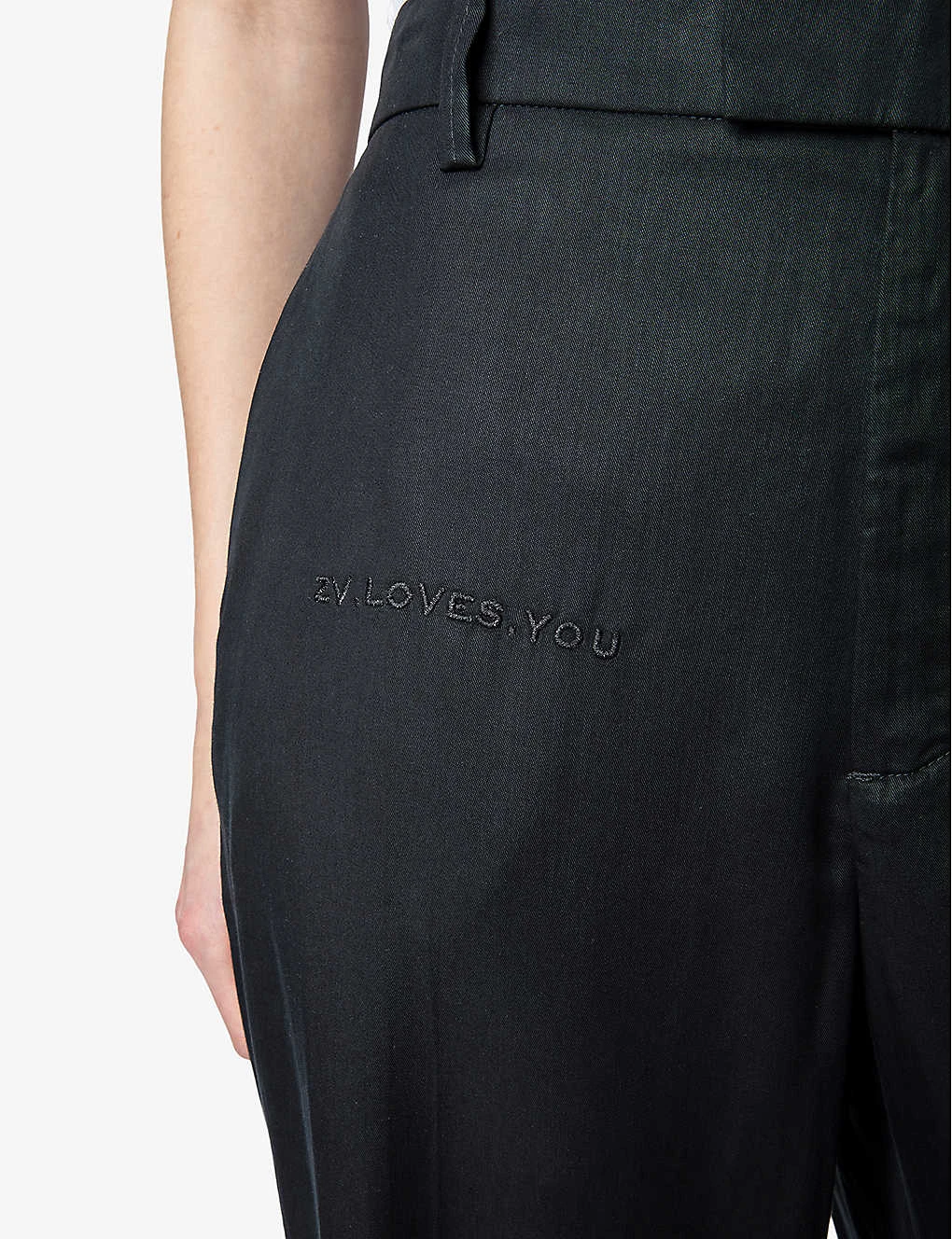 - Wide-leg, high-rise, belt loops, ZV LOVES YOU, embroidery at front, buttoned jet pockets at back